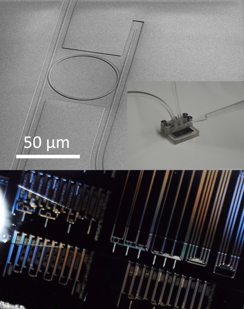 We have been working with CORNERSTONE – the EPSRC funded Silicon Photonics foundry to develop scalable Silicon Nitride devices which are functionalised in collaboration with our colleague in the school of Biosciences to selectively sense water contaminants such as heavy metals. In the figure we show a) an electron microscope image of a silicon nitride microring resonator sensor which can interact with fluids in a microfluidic channel etched into the device.